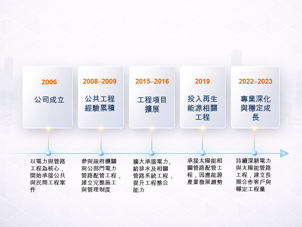 - 技術發展-本公司將深耕各管路建置技術的發展以達到管路工程領域技術多樣化的目標。並將擴充專業的工程機具來增加技術能量。